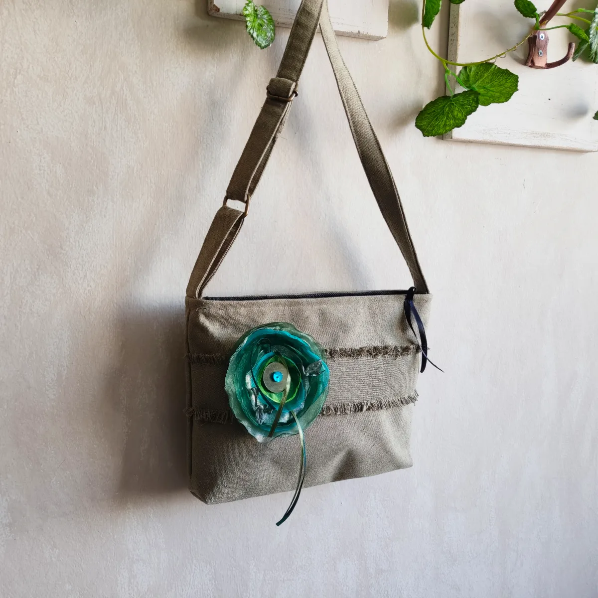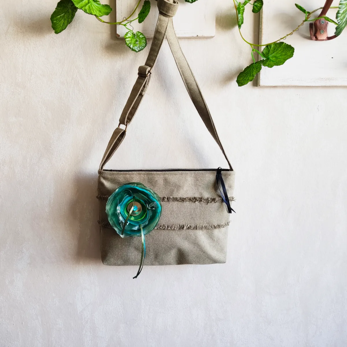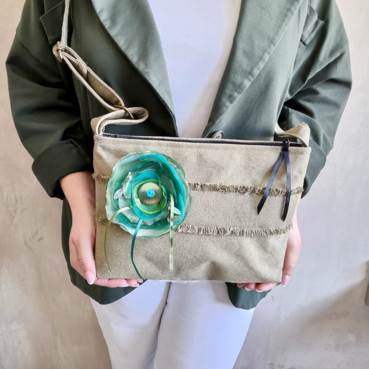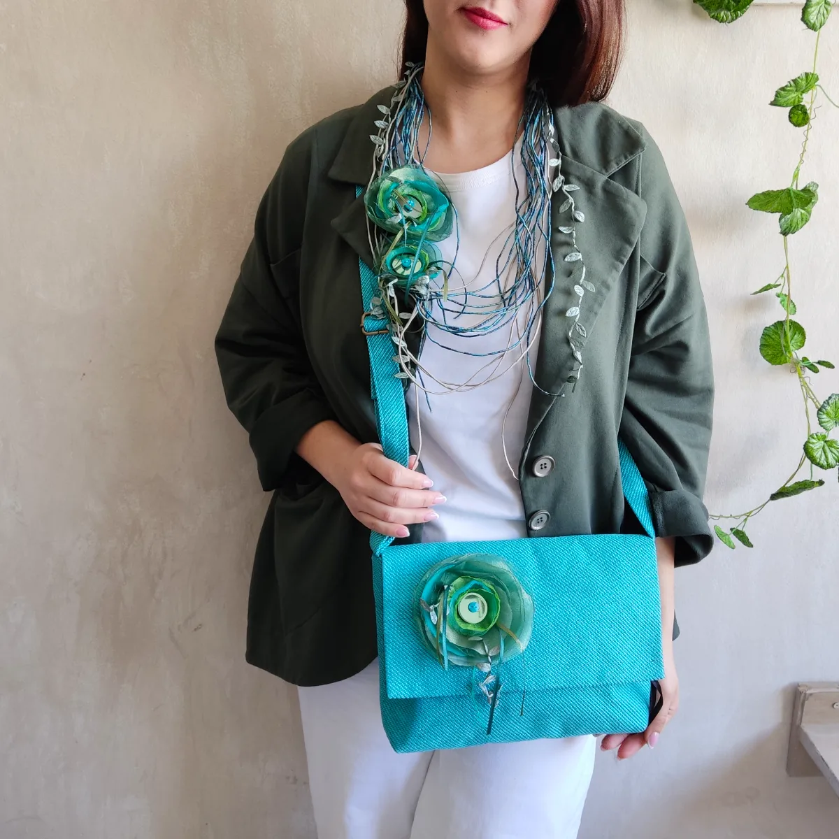 • Χειροποίητη τσάντα χιαστί με κόσμημα της συλλογής “Leaflets”